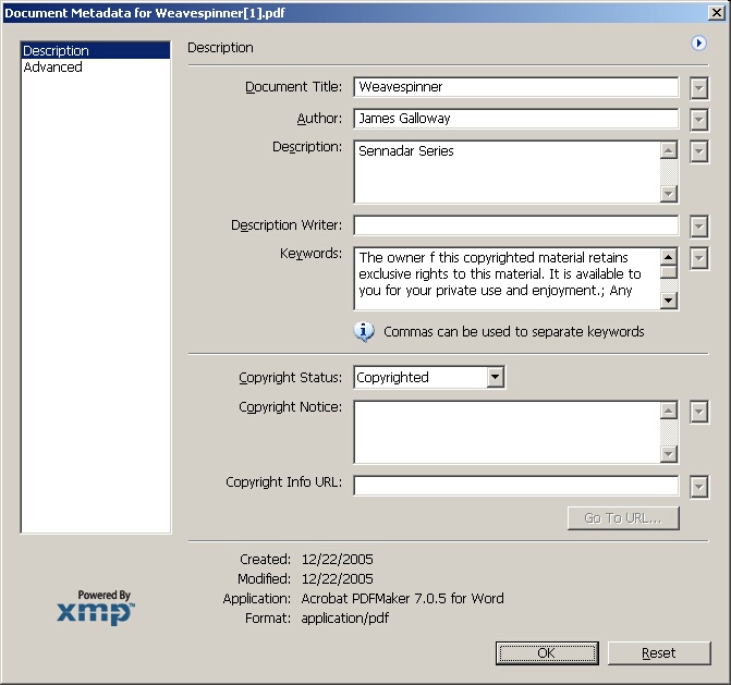 I see that Someone attempted to make sure the Copyright data is in the Properties section of the PDF ...but put the Copyright notice in the Keywords section ....not the Copyright section In the Full version of Adobe Accrobat there is a section set aside just for Copyright info and to enter a URL for Copyright info...