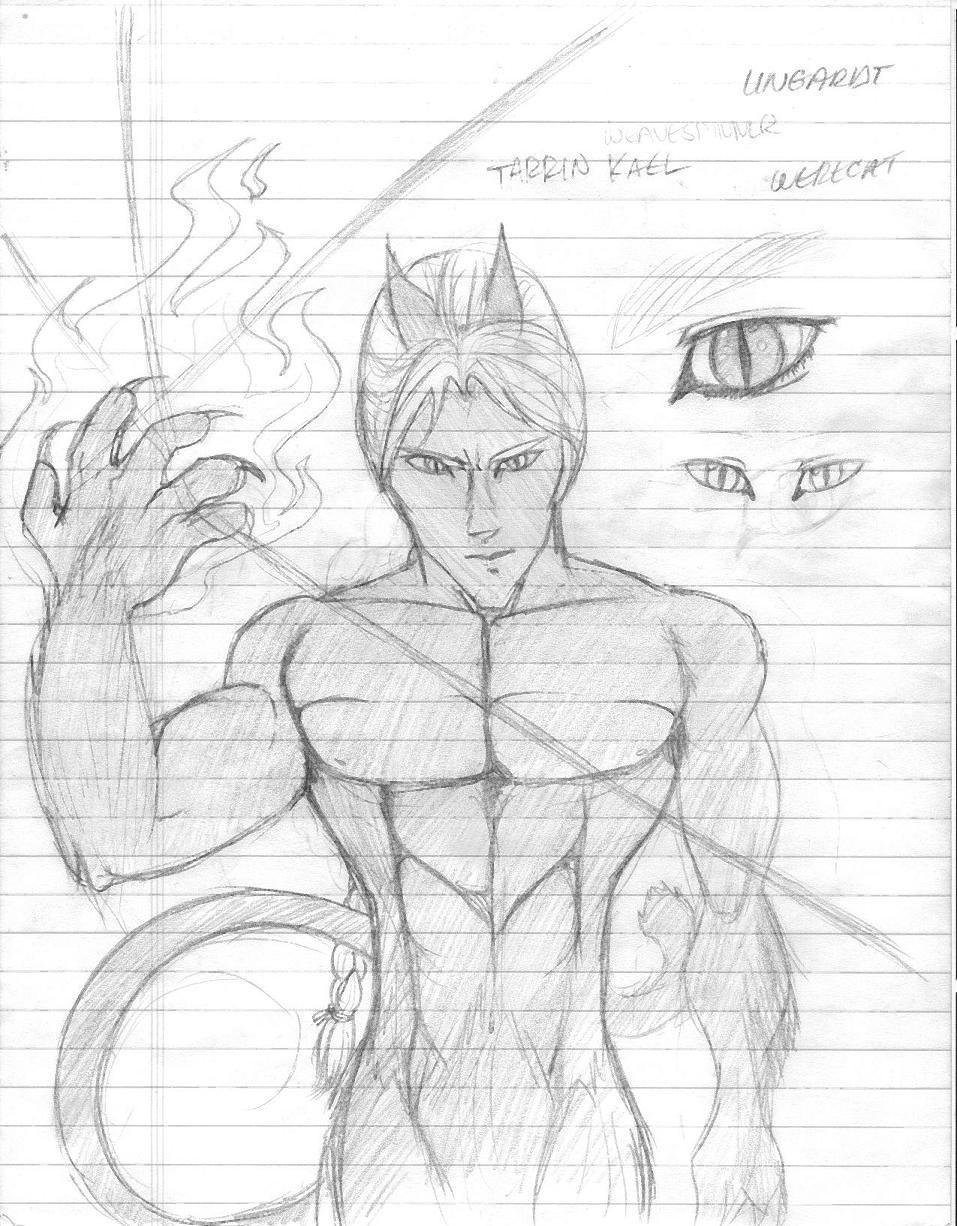 Tarrin Kael is 7'9" tall. He appears human except for his arms, legs, eyes, and ears, with a muscular yet lithe build, the body of a gymnast, though he does have fairly wide shoulders. He's ruggedly handsome in the manner of a Norse warrior (his Ungardt heritage). His eyes are green with vertically slitted pupils.